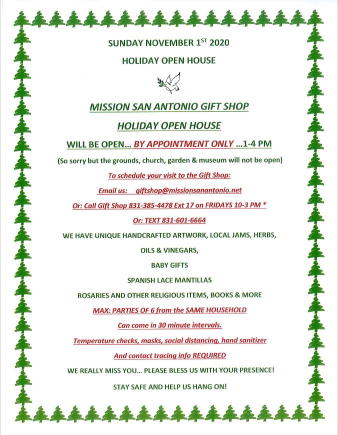 The Mission San Antonio Gift Shop will be open buy appointment for holiday shopping
